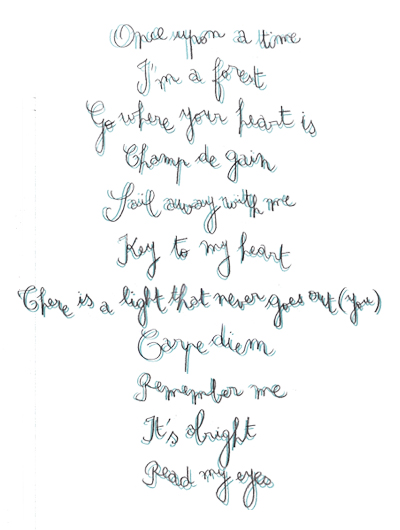 Comme dans tout voyage, on envoie des cartes postales aux amis, et Copenhagen a également choisi un support papier pour s’exprimer. L’objet que vous tenez entre les mains, poster dessiné par Stéphanie Cabdevila, a été sérigraphié aux ateliers Pan! à Nantes. Il constitue l’album dans son support original, puisque vous y trouverez le code de téléchargement vous permettant d’écouter la musique de Copenhagen. Il s’agit donc d’une carte postale d’un genre nouveau, une carte postale graphique et musicale, envoyée depuis une contrée lointaine. Celle de l’imaginaire de Lionel Fahy et Stéphanie Cabdevila.